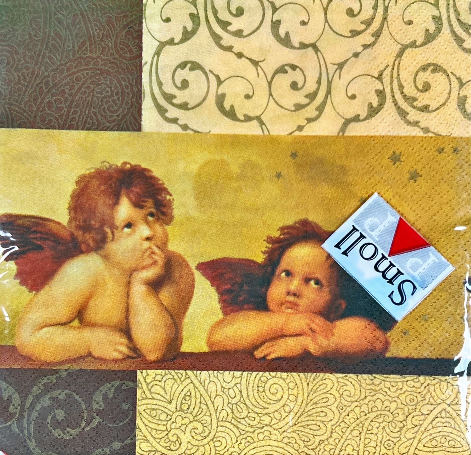 Eleganckie serwetki papierowe z nadrukiem aniołków w odcieniach beżu i złota.